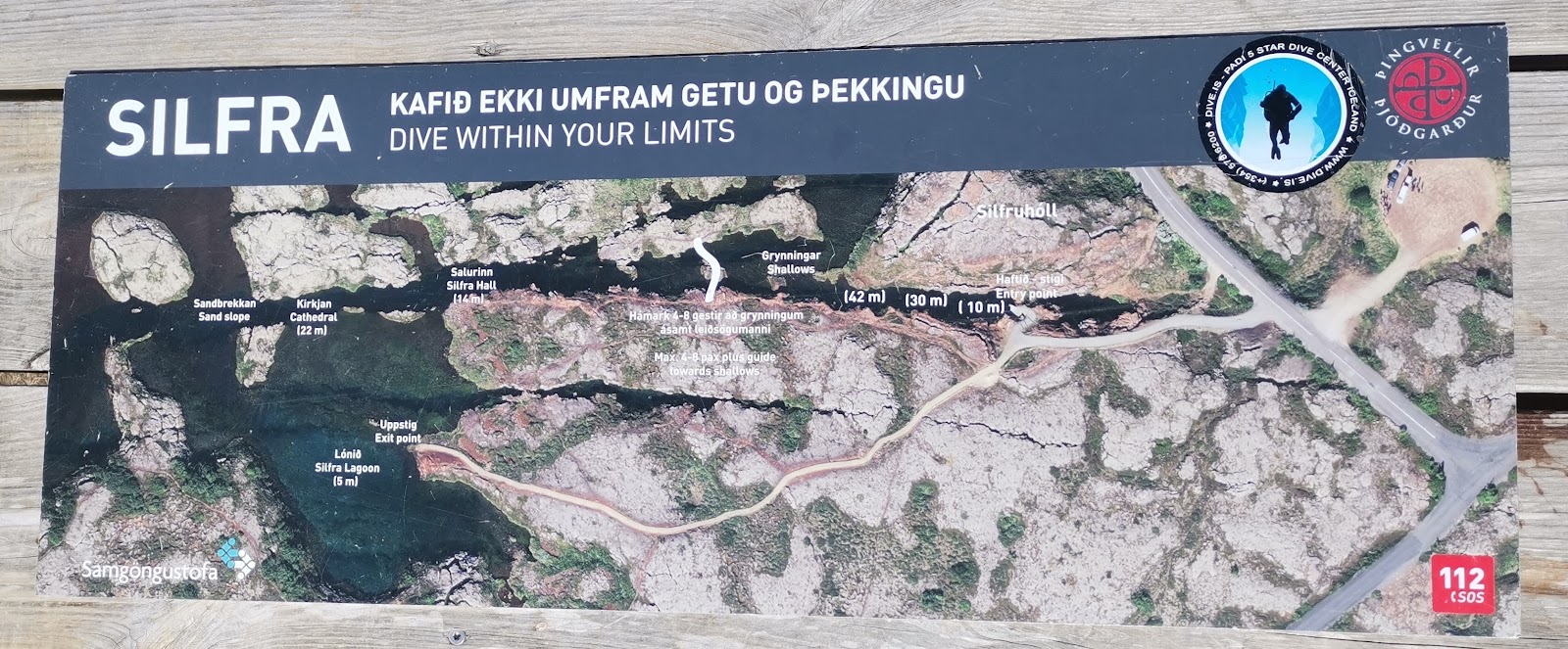 Floating in freezing clear, cold water, 60m deep in some places and shallow enough to stand in others. Massive underwater rock formations made from collapsed rock and magma from volcanic incidents, covered in luminous blue, green, orange and yellow algae. No fish and so very quiet.